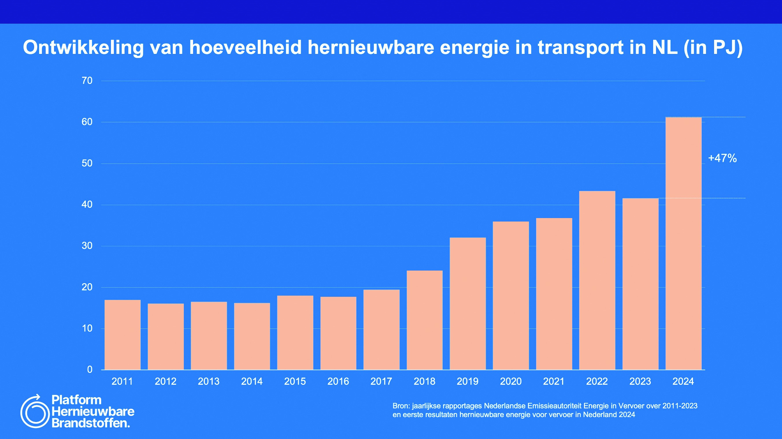 De sector gaat van 17 PJ duurzame biobrandstoffen in 2011, naar 41,6 PJ in 2023. En in 2024 springt het vervolgens met 47% omhoog naar 61,2 PJ fysiek volume. Dat is echt substantieel.